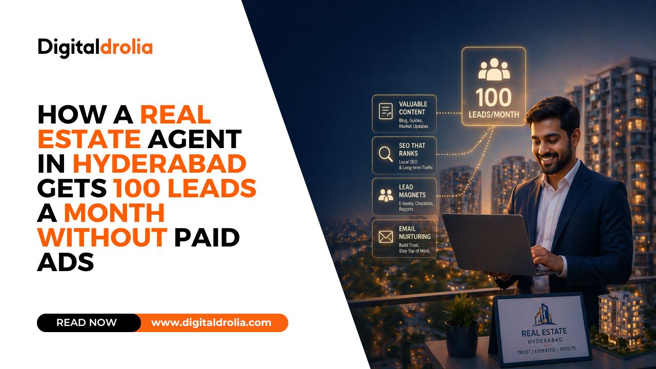 Digital Drolia Blog, SEOHow a Real Estate Agent in Hyderabad Gets 100 Leads a Month Without Paid AdsDigital DroliaApril 23, 2026