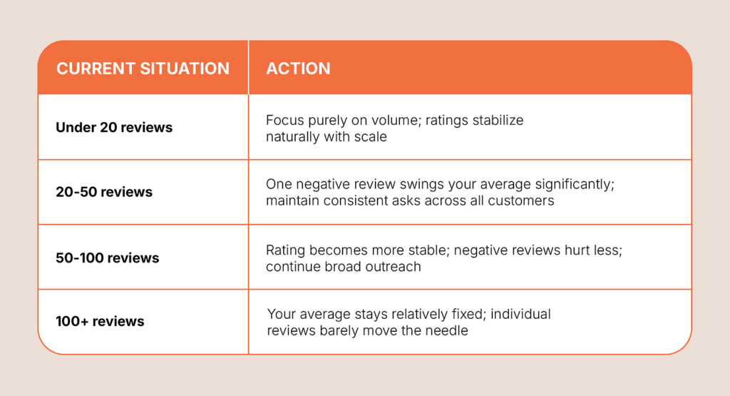At a certain review volume, the question a potential customer is asking shifts entirely. With 10 reviews, they are wondering: “Is this business legitimate? Can I trust it?” With 200 reviews, they are no longer asking that question. That question has been settled. They are now asking: “Is this the right fit for my specific need?” — which is a much easier question to answer, and one that works in your favor.
